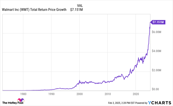 Walmart (NYSE: WMT) evolved from a modest Arkansas store to a dominant global retailer. Today, around 90% of Americans live within ten miles of a Walmart. An investment of $1,000 made in 1972 would now be worth nearly $7.2 million.