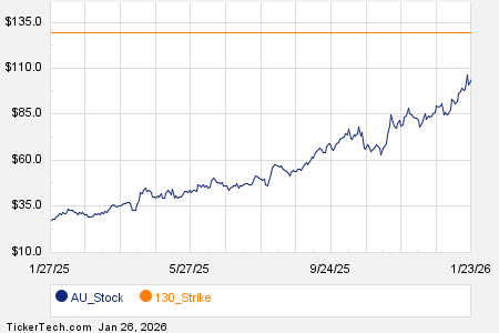 Below is a chart displaying NBIX’s trailing twelve-month trading history, with the $125 strike highlighted in orange: