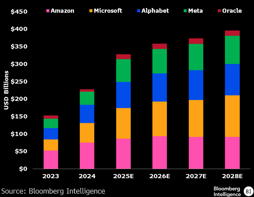 In total, Amazon, Microsoft, Alphabet, Meta, and Oracle (ORCL) are projected to allocate nearly $350 billion in capital expenditures this year, with estimates nearing $400 billion by 2028.