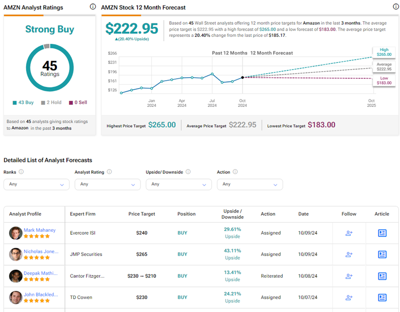 Investor sentiment towards Amazon stock is predominantly positive. According to TipRanks, AMZN holds a Strong Buy consensus rating, with 43 Buy ratings against just two Holds. The average price target for Amazon is set at $222.95, indicating a potential 20.4% upside from current trading levels. As of now, AMZN shares are up 21.9% this year.