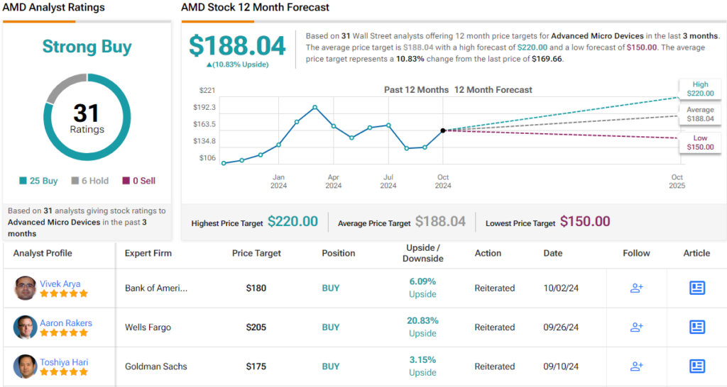 Analysts remain optimistic about AMD, viewing it as a ‘Strong Buy,’ with forecasts suggesting an 11% upside potential and a price target of $188.04.