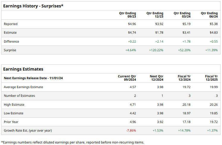 Looking ahead to fiscal year 2024, analysts forecast an adjusted EPS of $19.72, up 14.8% from $17.18 in FY 2023. Moreover, for FY 2025, the adjusted EPS is projected to increase slightly by 1.4% to $19.99.