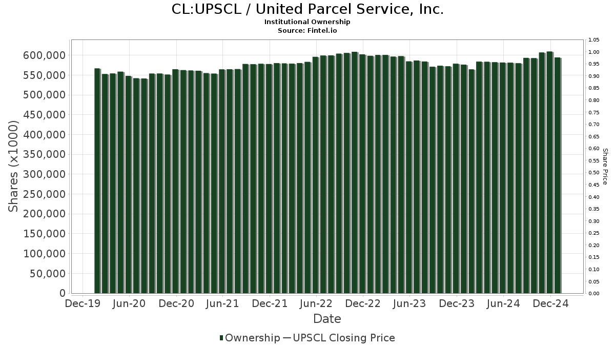 There are 3,190 funds or institutions reporting positions in United Parcel Service. This is an decrease of 38 owner(s) or 1.18% in the last quarter. Average portfolio weight of all funds dedicated to UPSCL is 0.43%, an increase of 0.83%. Total shares owned by institutions decreased in the last three months by 1.24% to 592,012K shares.