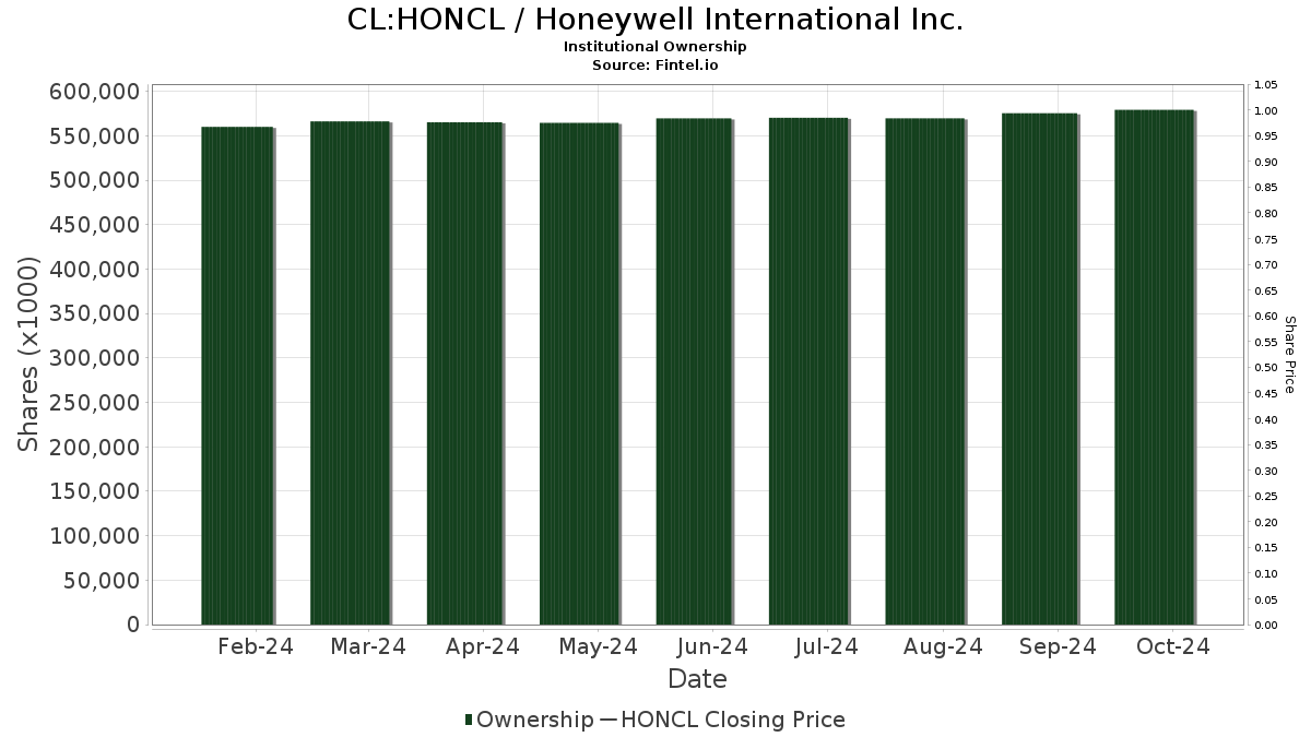 Currently, 3,573 funds or institutions hold positions in Honeywell International. This reflects an increase of 40 funds, or 1.13%, in the last quarter. The average portfolio weight for all funds dedicated to HONCL is 0.45%, which is an increase of 0.91%. Over the past three months, total shares owned by institutions rose by 1.61%, totaling 579,241K shares.