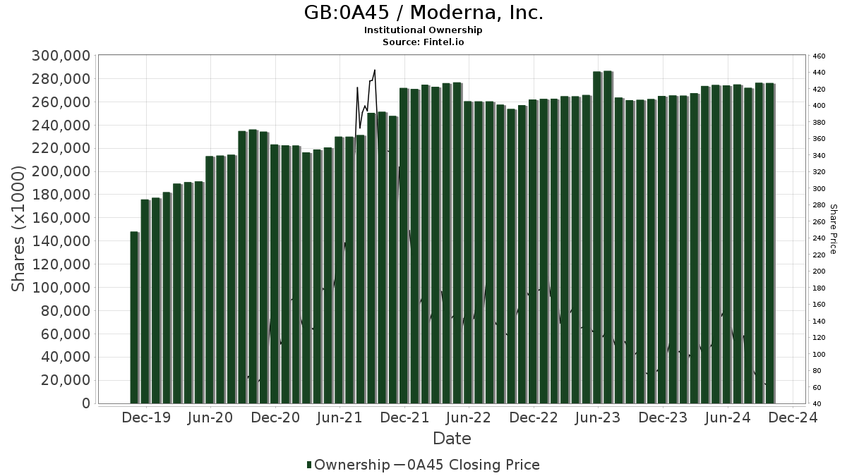 A total of 1,640 funds and institutions currently report positions in Moderna, marking an increase of 2.18% (35 new owners) from the previous quarter. The average portfolio weight for all funds dedicated to 0A45 is 0.28%, up by 2.10%. Over the past three months, total shares owned by institutions have risen by 2.70%, reaching 276,183K shares.