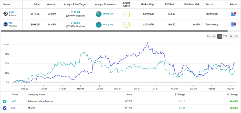 Support from the analyst community is strong for both companies. AMD enjoys a Strong Buy consensus rating, with 26 Buys against 6 Holds, while its average price target sits at $187.04, suggesting a 27% increase over the next year. (See AMD stock forecast)