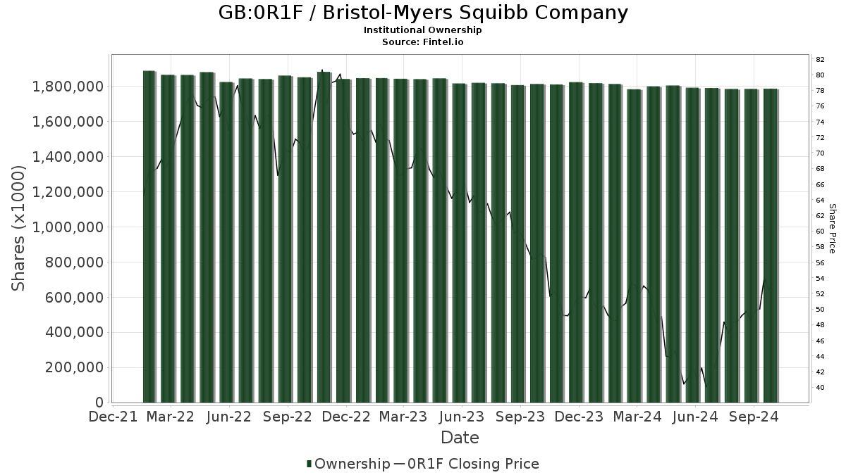 Currently, there are 3,364 funds or institutions with reported positions in Bristol-Myers Squibb. This marks a drop of 94 owners or 2.72% over the past quarter. The average portfolio weight across all funds dedicated to 0R1F is now 0.36%, which has risen by 9.01%. Institutions increased their total shares owned by 1.80% in the last three months, bringing the total to 1,790,322K shares.