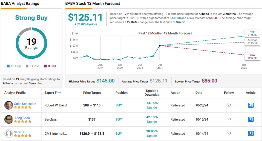 Many experts on Wall Street share this positive outlook. With 16 Buy ratings versus 3 Holds, the analyst consensus assigns BABA stock a Strong Buy rating. The average price target is notably more optimistic than Sebastian’s, set at $125.11, which points to about 30% potential returns over the next year. (See Alibaba stock forecast)