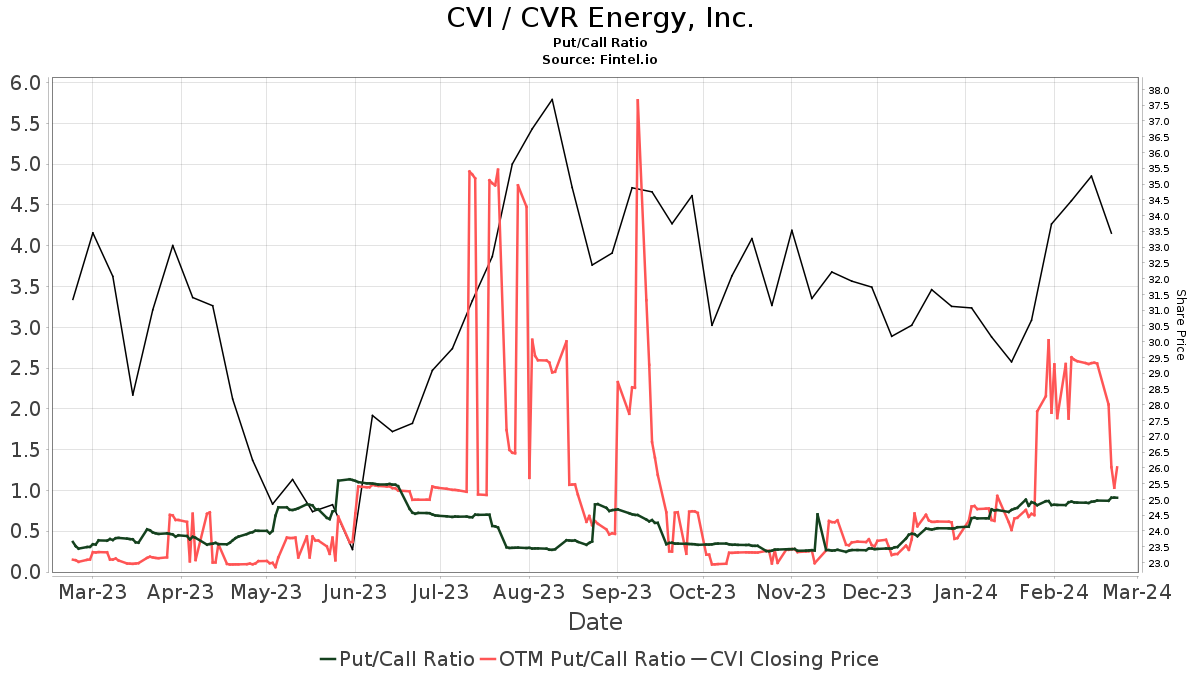 A flotilla of 561 funds or institutions now charts a course with CVR Energy. In the last quarter, this number swelled by 23, marking a 4.28% increase. On this voyage, the average portfolio weight of all funds dedicated to CVI slackened to 0.15%, a downshift of 4.22%. Institutions hoisted their holdings by 3.60%, now anchoring 112,785K shares in the past three months. The put/call ratio, marking the sentiment towards CVI, stands at 0.91, a bullish wind in the sails.