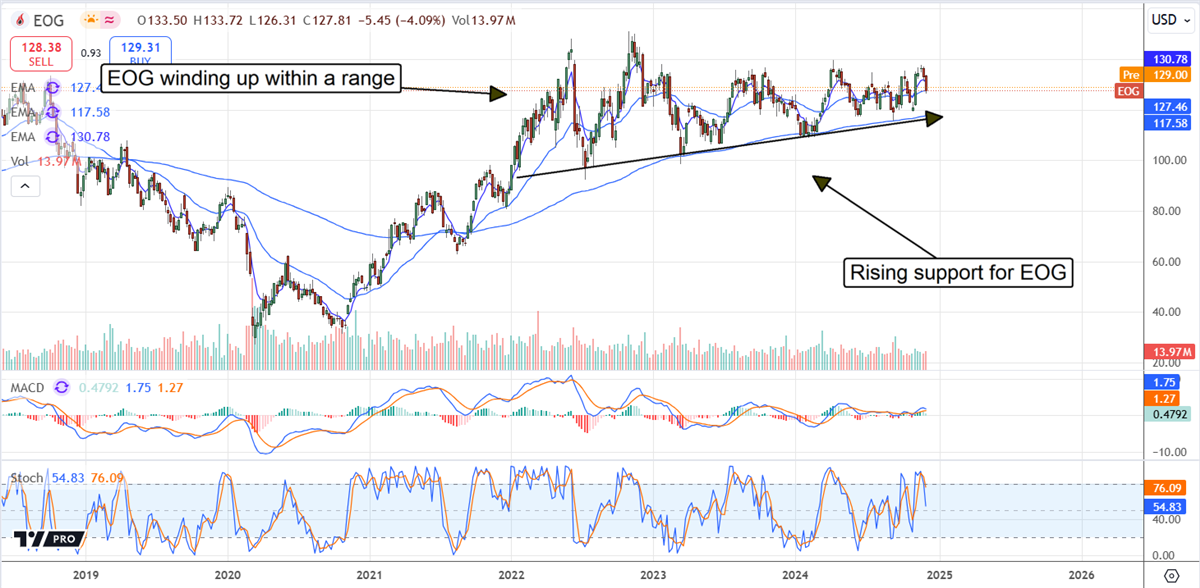 Currently, critical support for EOG stock lies near the 150-day Exponential Moving Average (EMA), which has provided price support since 2021 and is expected to continue. It’s likely that the stock will retest this support level, potentially resulting in another price bounce. The uncertainty remains whether this bounce will gain traction, propelling the stock price higher, or if it will continue to trade sideways. If institutional activity turns positive, a movement towards new highs becomes plausible, with key resistance levels located near $140 and $149.