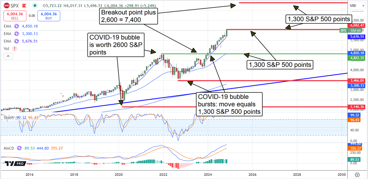 A critical insight for today’s investors is drawn from the COVID-19 bubble, which initially pushed the S&P 500 to a peak near 4,800, contributing 2,600 points. This serves as the first projection, indicating a potential rise to 7,400 if the previous trading range is broken. The second projection stems from the post-pandemic market correction, where the index dropped nearly 30%, establishing a strong support range at 5,500. The current upward trajectory suggests a possible advance of another 1,300 points, reinforcing the potential to reach 7,400 if the critical point at 6,100 is surpassed.