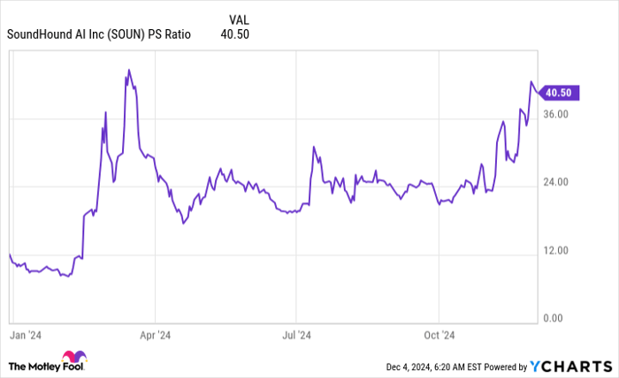 SOUN PS ratio, data by YCharts; PS = price to sales.