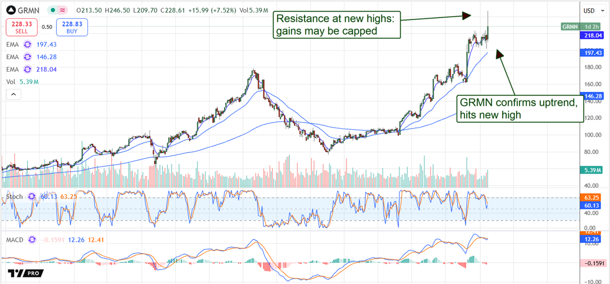 The stock price action indicates resistance at new all-time highs, yet Garmin has successfully set these new records. This momentum suggests an ongoing uptrend. However, there is a risk that these post-release highs may limit gains early in 2025. Nevertheless, increased institutional activity in the market, reflected by heightened buying and selling volumes, provides reassurance. Notably, Q1 saw significant institutional purchasing activity.