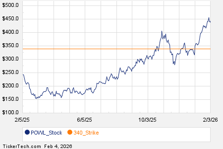 LPL Financial Holdings Inc (LPLA) also experienced significant trading, with 2,895 contracts representing roughly 289,500 underlying shares, or 42.2% of its average daily trading volume of 686,810 shares. A specific focus was placed on the $410 strike call option expiring February 20, 2026, with 2,838 contracts traded, symbolizing approximately 283,800 shares.
