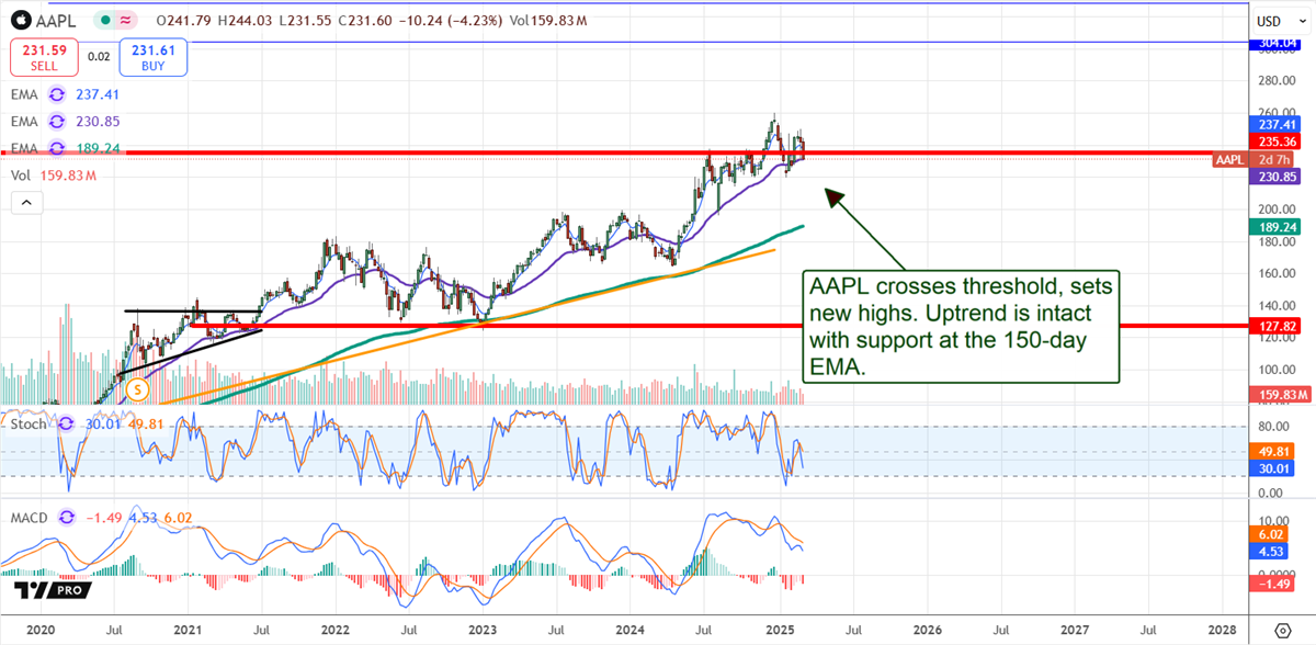 In late 2024, Apple’s stock crossed a significant market threshold, reaching an all-time high before retreating to establish support at the 150-day EMA. This pattern indicates a continuation of underlying market trends into 2025, although the timeline for a new peak remains uncertain.