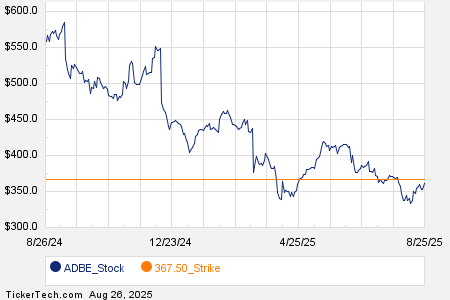 Adobe Inc (ADBE) reported options trading volume of 19,730 contracts today, equating to approximately 2.0 million underlying shares, which represents 52.5% of its average daily trading volume of 3.8 million shares over the past month. Notably, the $367.50 strike call option expiring on August 29, 2025, accounted for 864 contracts, or about 86,400 underlying shares.