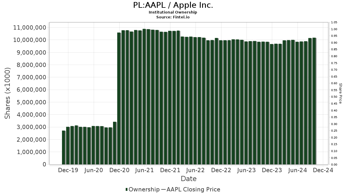 A total of 7,110 funds or institutions are currently invested in Apple, marking an increase of 217 owners, or 3.15%, over the last quarter. The average portfolio weight dedicated to AAPL across all funds rose to 3.62%, an increase of 12.91%. In the past three months, institutional ownership has seen a 6.45% rise, reaching 10,272,177K shares.