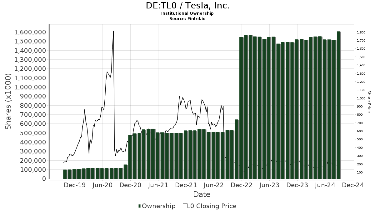 Currently, there are 4,291 funds or institutions reporting stakes in Tesla, a rise of 87 owners (2.07%) from the last quarter. The average portfolio allocation dedicated to TL0 across all funds is 0.89%, which is an increase of 8.31%. Institutions have increased their total shareholdings in the past three months by 7.12%, now totaling 1,621,996K shares.
