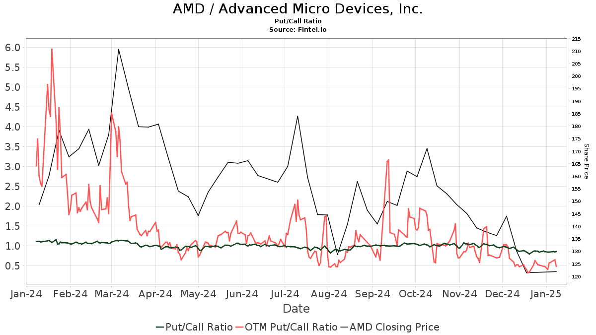 The put/call ratio for AMD is 0.83, suggesting a bullish outlook among investors.