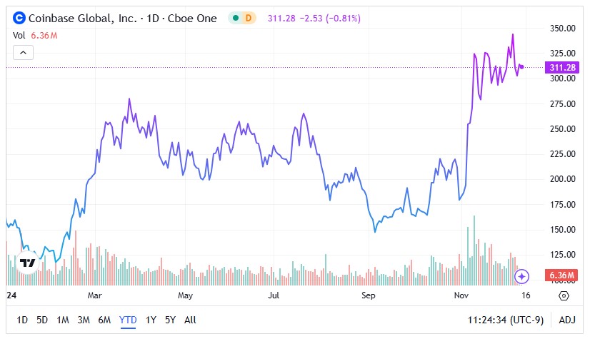 After the recent election results, Coinbase’s stock surged; however, it has since stabilized in a sideways pattern. The potential for another upward movement exists, but this is heavily linked to the overall health of the cryptocurrency market. With the total market capitalization of digital assets surpassing $3.6 trillion, a market correction could be on the horizon.