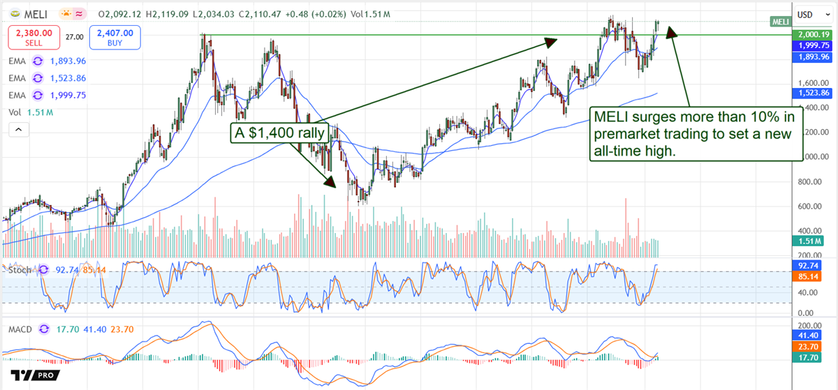 In light of its Q4 performance, MercadoLibre shares surged over 12% in early premarket trading, marking a new high that brings exciting potential targets into focus.