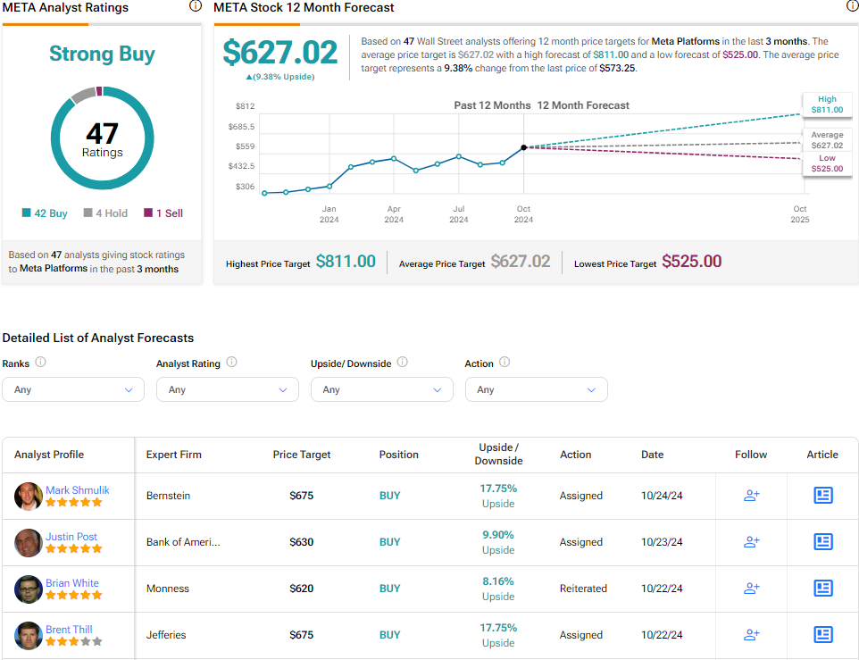 On Wall Street, analysts are optimistic about META stock, giving it a Strong Buy consensus rating based on 42 Buys, four Holds, and one Sell over the last three months. Following an impressive 98% increase in share price over the past year, the average price target for META stands at $627.02 per share, suggesting a potential upside of 9.4%.