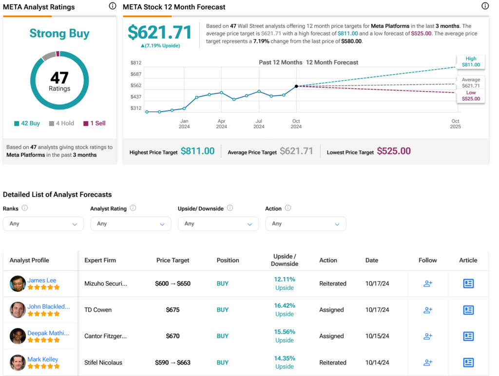Wall Street analysts currently rate META stock as a Strong Buy. This consensus includes 42 Buys, four Holds, and one Sell in the latest three months. Over the past year, Meta’s share price has surged by 83.47%. Analysts anticipate an average price target of $621.71 per share, suggesting a potential upside of 7.19% from its current price.