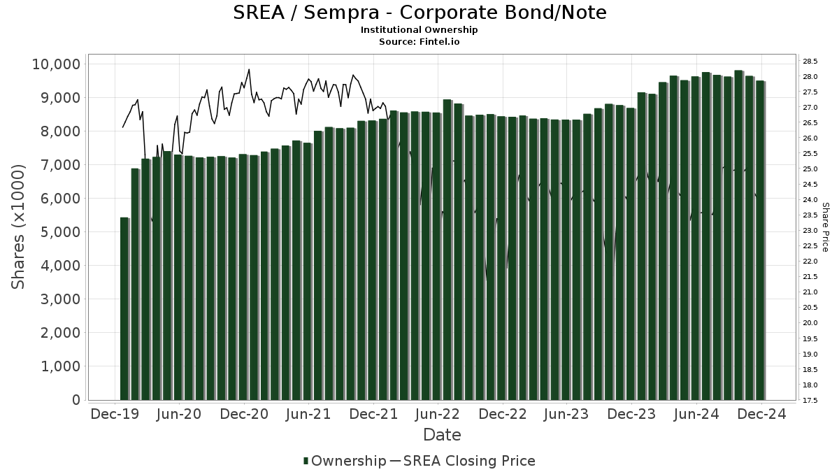 Currently, 30 funds and institutions hold positions in Sempra – Corporate Bond, with the number unchanged from the previous quarter. The average portfolio weight of these funds in SREA has risen by 10.81% to 0.55%. However, the total shares owned by institutions dropped by 1.26% over the last three months, totaling 9,501K shares.