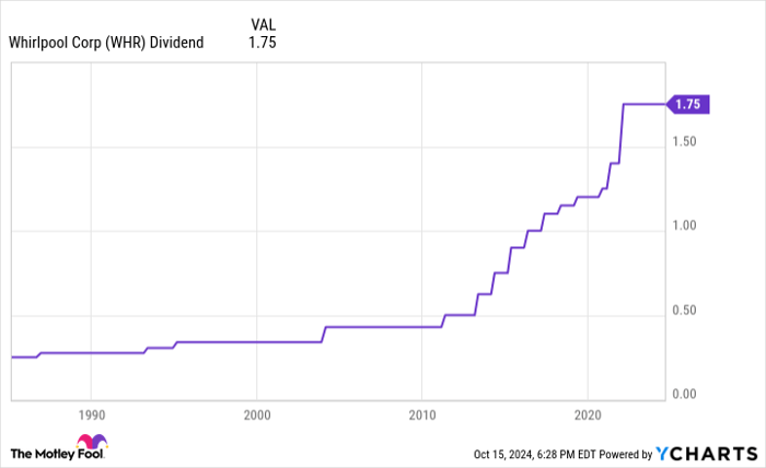 While researching appliances, I deeply examined Whirlpool’s stock. I was impressed to find a dividend yield approaching 7%. This company has a long history, having issued dividends for around 70 years. Though it hasn’t raised its payout consistently every year—last increasing it in 2022—it has never cut its dividends: