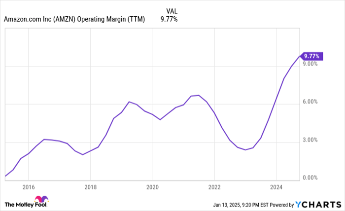 Amazon, a tech leader benefiting from rising AI spending, stands out as a low-risk stock. It operates in a less cyclical industry, has improving margins, and could see revenue growth accelerate in 2025. This tech titan leads in both e-commerce and cloud computing.
