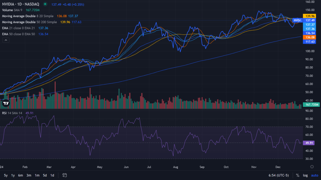 Technical evaluations show that Nvidia’s stock remains bolstered by its 20-day exponential moving average. As of Monday, shares closed at $137.49, slightly above the 21-day exponential moving average of $137.36 and the 20-day simple moving average of $137.37. However, it is trading below the 50-day simple moving average of $139.96 while staying above the 200-day simple moving average of $117.63.