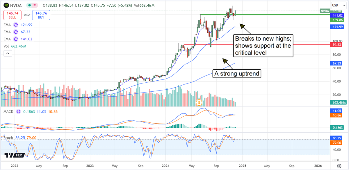 Late 2024 shows a bullish trend for NVIDIA, with stock prices reaching new all-time highs and holding strong at critical levels. This key support aligns with a prior all-time peak and the upper limit of a consolidation area. The next significant upward movement could push stock prices beyond the crucial resistance target of $150, which may lead to additional upward momentum, possibly driving the market towards the $190 to $200 range.