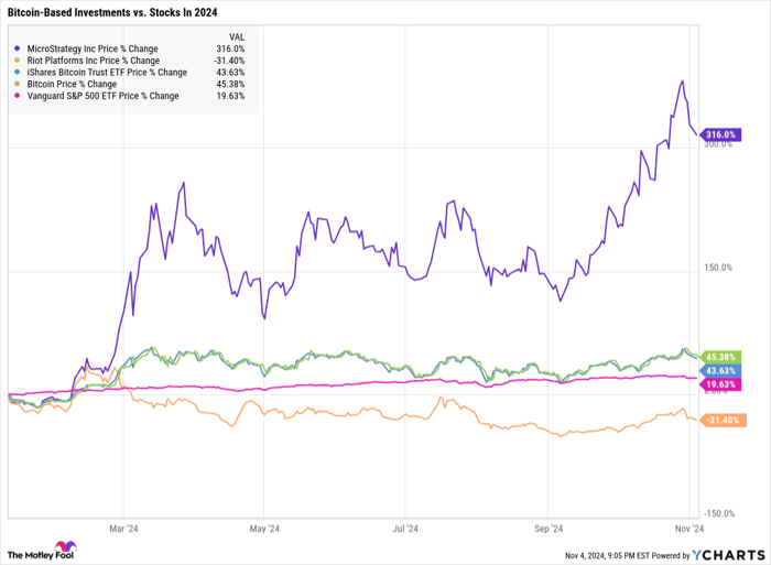 The performance of these Bitcoin-related investments since the launch of spot Bitcoin ETFs on January 10 provides insight into the mixed results of crypto investments. While MicroStrategy has rallied, Riot Platforms has struggled, and Bitcoin itself has outperformed the stock market in 2024: