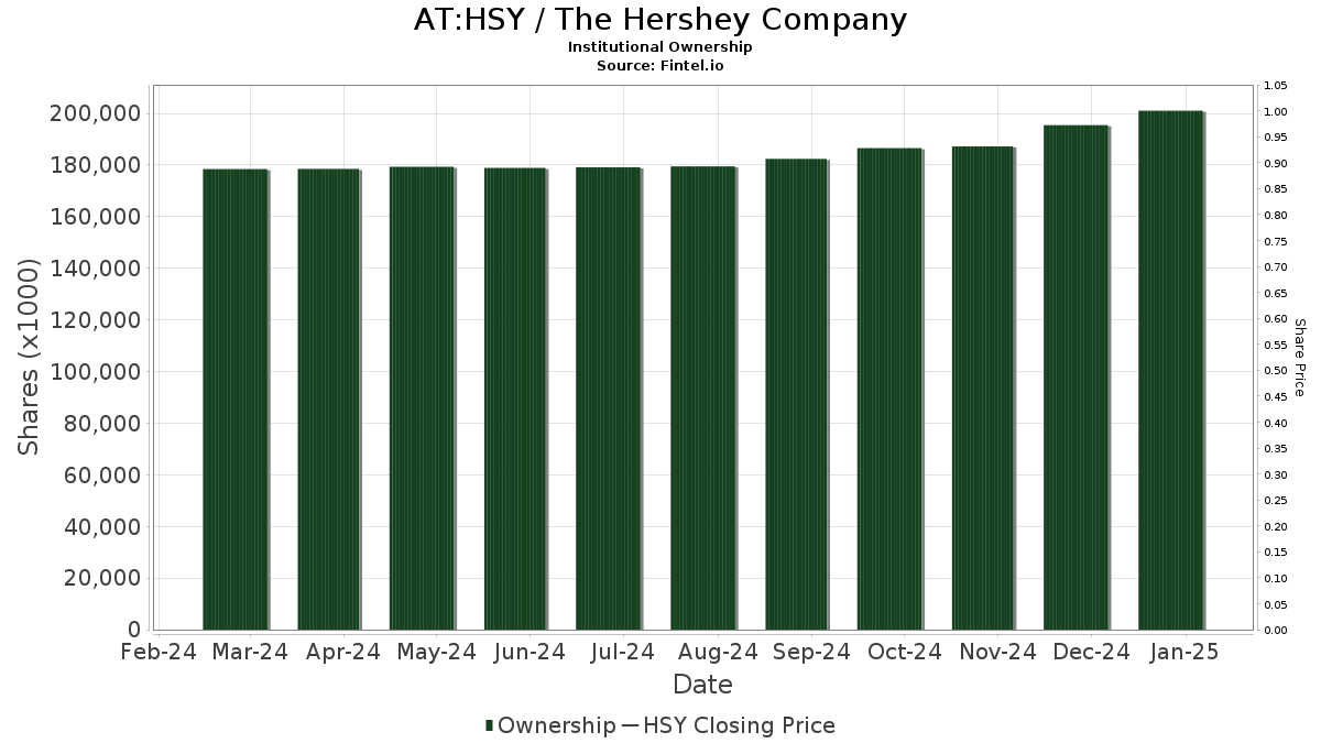 There are 2,171 funds or institutions reporting positions in Hershey. This is an decrease of 15 owner(s) or 0.69% in the last quarter. Average portfolio weight of all funds dedicated to HSY is 0.30%, an increase of 0.38%. Total shares owned by institutions increased in the last three months by 6.85% to 200,791K shares.