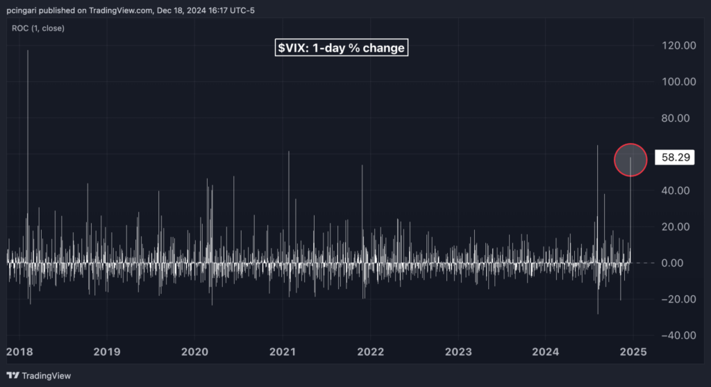 The CBOE Volatility Index, known as the VIX and Wall Street’s fear gauge, skyrocketed 58% to 25, reflecting a spike in investor uncertainty and heightened anxiety over the future of interest rates.