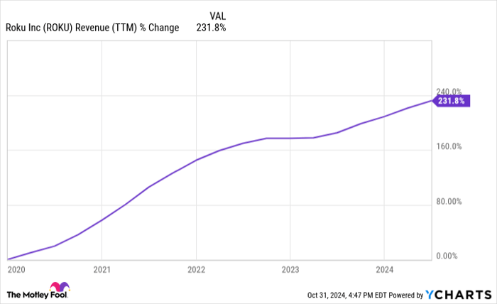 While Roku’s stock has seen a decline of nearly 60% over the past five years, its revenue has soared by 232% cumulatively. The challenge lies in improving profitability.