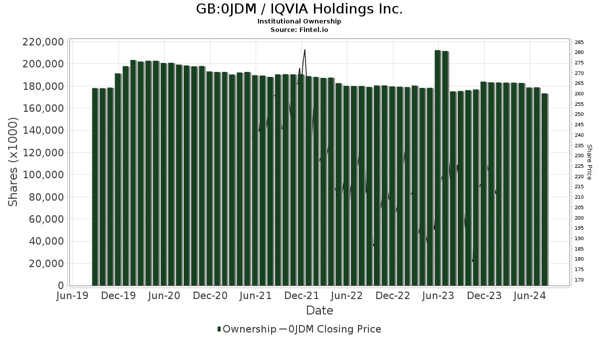 Currently, 1,827 funds or institutions hold positions in IQVIA Holdings, marking an increase of 27 owners (1.50%) over the last quarter. The average allocation of all funds to 0JDM is 0.32%, up by 11.32%. In total, institutional ownership rose by 2.46%, reaching 177,248K shares in the past three months.