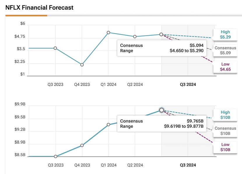 Netflix projects a 14% revenue increase and a 28.1% operating profit margin for Q3. Analysts anticipate earnings per share (EPS) above $5.09 and revenues surpassing $9.765 billion. While some analysts revised their EPS estimates upward, revenue predictions remain mixed, showcasing uncertainties in the market.