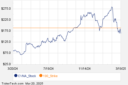 Today, the Russell 3000 index highlighted notable trading activity in several companies, particularly Carvana Co (Symbol: CVNA). A total of 125,425 contracts have changed hands, indicating trading of approximately 12.5 million underlying shares. This figure is about 224.2% of CVNA’s average daily trading volume of 5.6 million shares over the past month. Significant interest was noted for the $190 strike put option expiring March 21, 2025, with 25,234 contracts traded, equating to roughly 2.5 million shares. The chart below illustrates CVNA’s trailing twelve-month trading history, with the highlighted $190 strike shown in orange: