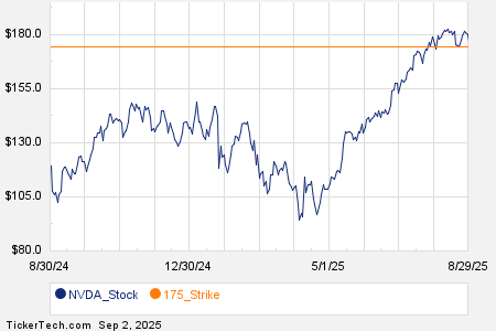 NVIDIA Corp (NVDA) experienced significant options trading today, with 2.0 million contracts traded, equating to 203.4 million underlying shares. This represents 119.5% of NVDA’s average daily trading volume of 170.2 million shares over the past month. Notably, the $175 strike call option expiring on September 5, 2025, saw high volume with 99,558 contracts traded, reflecting approximately 10.0 million underlying shares.