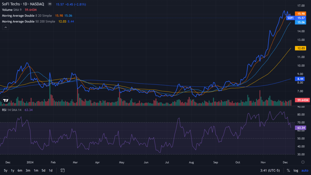 From a technical standpoint, daily moving averages indicate significant support for SoFi’s stock. Although it dropped nearly 3% on Monday and further to $15.56 after hours, the stock remains above its 20, 50, and 200-day simple moving averages. Specifically, the 20-day average is $15.06, while the 50-day and 200-day averages are $12.03 and $8.44, respectively.