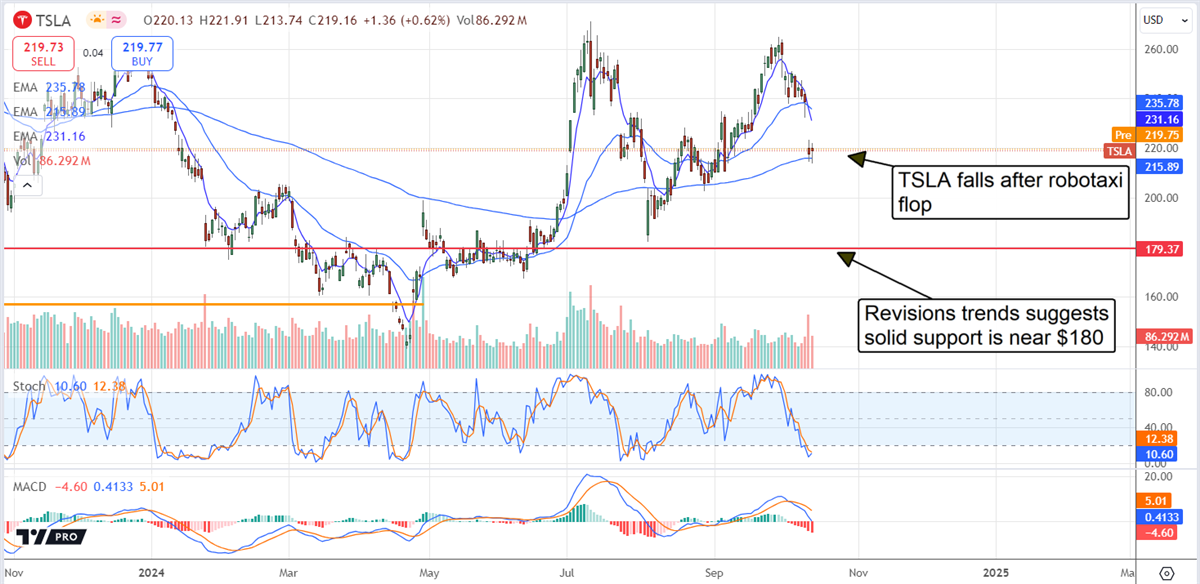 The recent trading activity for TSLA stock has not been encouraging. Following the We Robot event, the stock fell 10% and is currently testing support within its trading range. Although some support is present, it lacks strength, indicating a high chance of stagnation or continued decline. A critical support point is the 150-day EMA, located near $215; if breached, the stock could swiftly drop to the $180 mark.