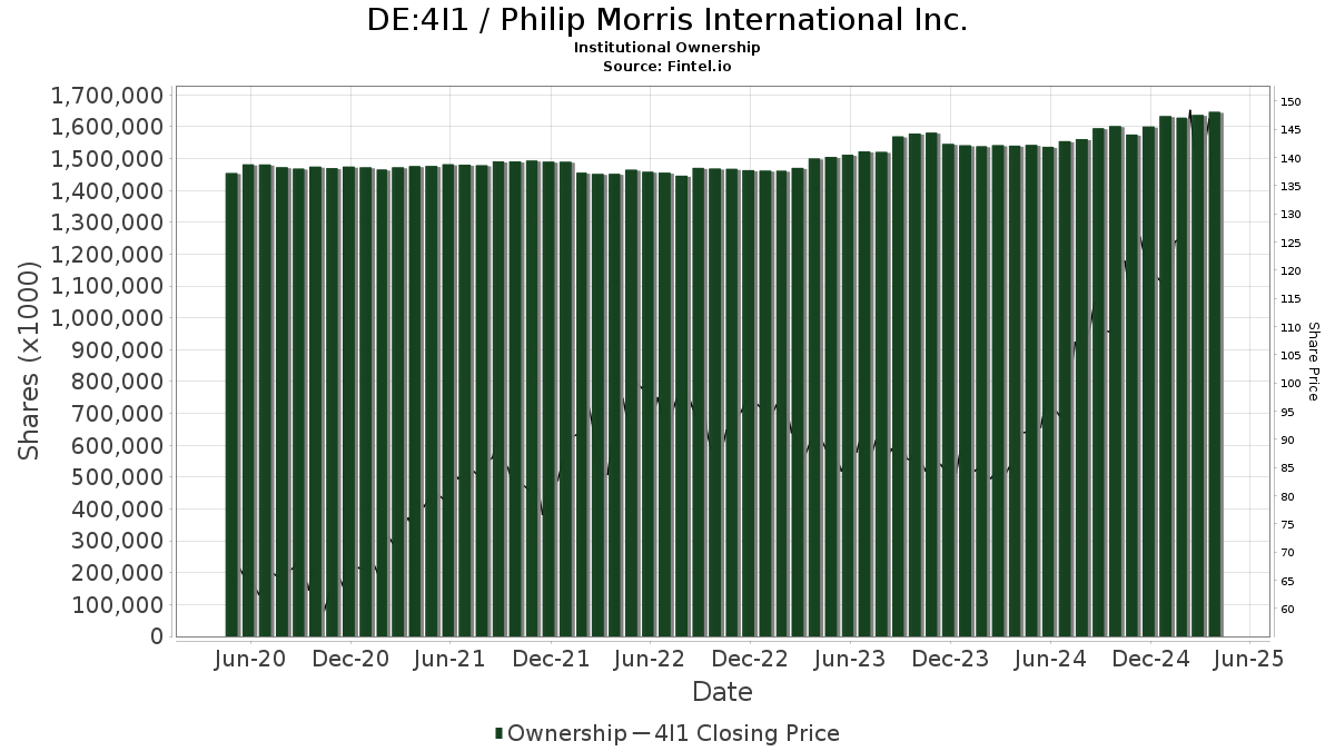 A total of 3,718 funds or institutions are currently reporting positions in Philip Morris International. This marks an increase of 272 owners, or 7.89%, over the last quarter. The average portfolio weight assigned to 4I1 by all funds has risen by 2.22% to 0.56%. As a result, total institutional shares owned have increased by 0.62% over the past three months, totaling 1,639,672K shares.