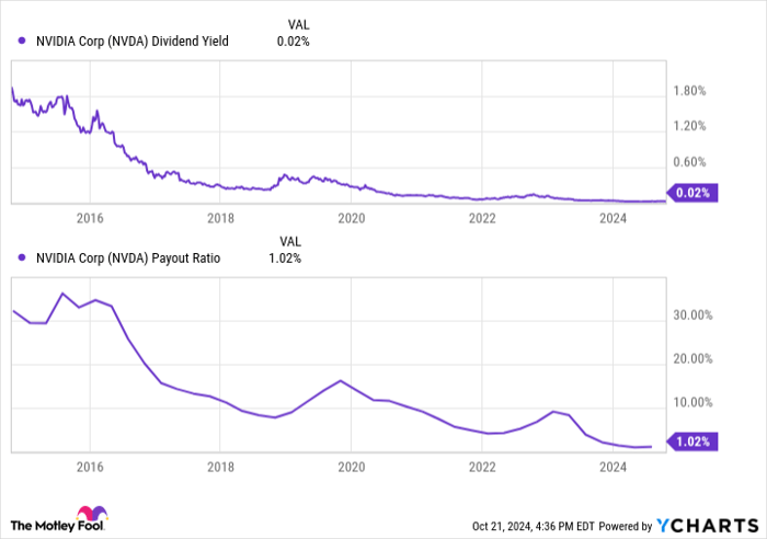 In 2020, Nvidia provided a quarterly dividend of $0.16 per share. But in 2021, that amount was slashed to $0.04 per share. By early 2024, it was further reduced to just $0.01 per share per quarter. These changes have brought Nvidia’s dividend yield down to a minimal 0.02%, with a payout ratio of only 1% of the company’s earnings.