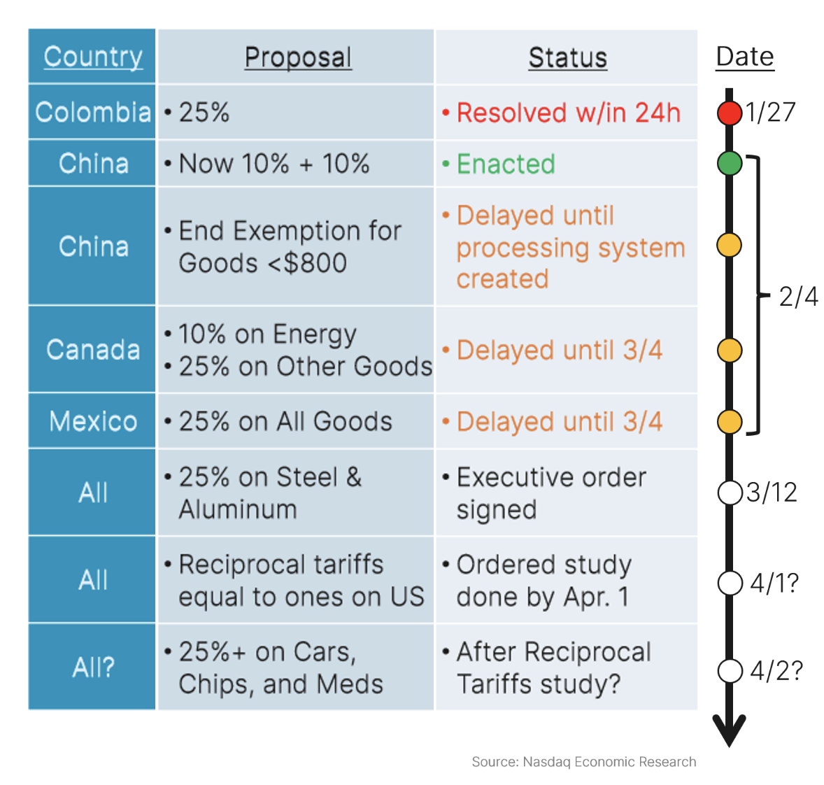 As we enter President Trump’s second term, tariffs have taken the spotlight. Currently, only the new 10% tariff on China is in effect. The rest of the proposed changes remain uncertain, especially concerning potential tariffs affecting Canada and Mexico.